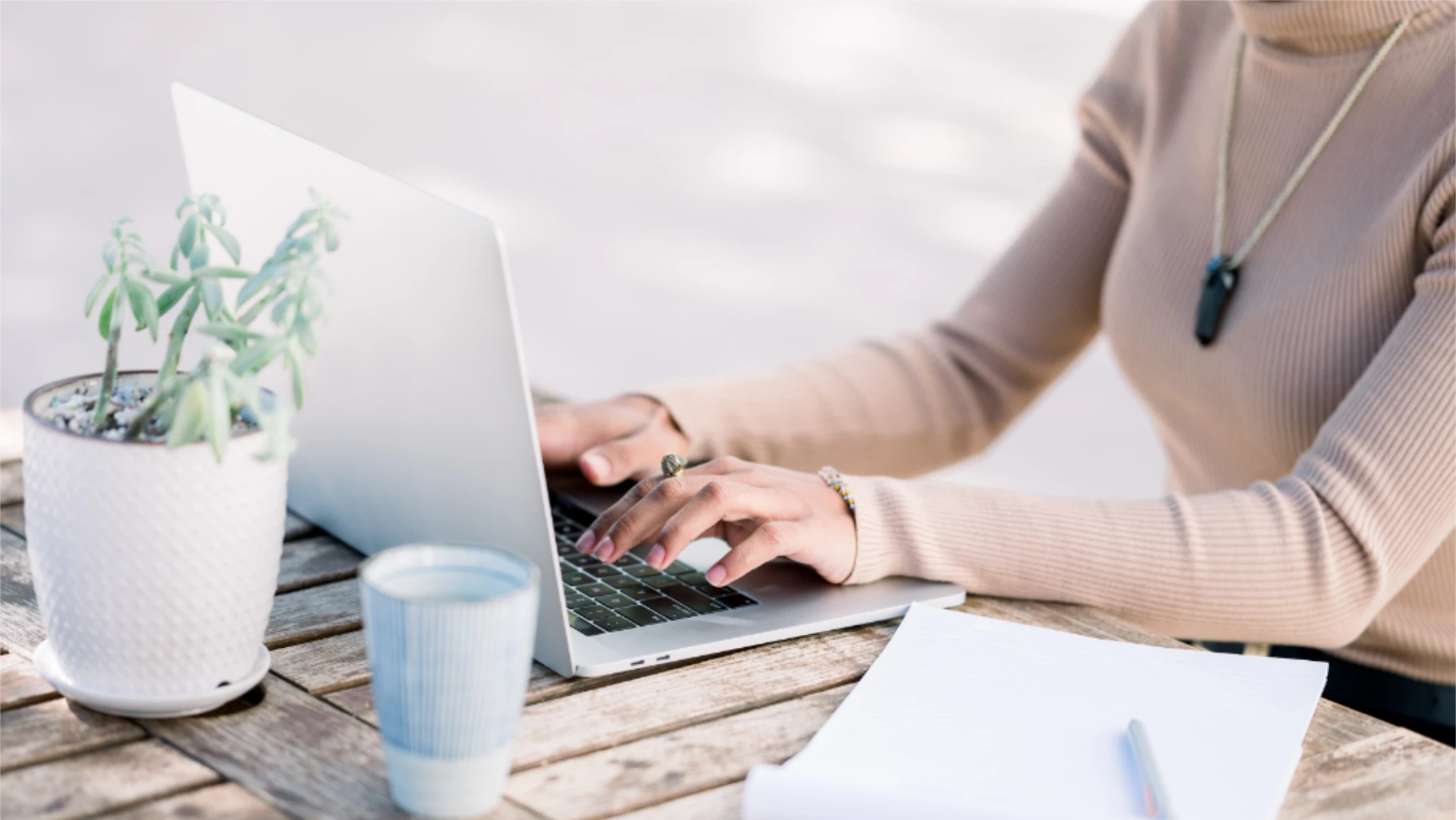 Woman writing in a notebook at a cafe with a laptop and coffee, representing planning with a website comparison checklist.